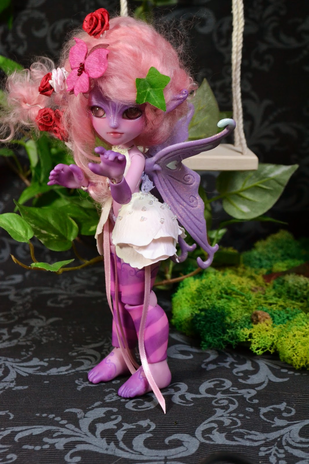 Il s'agit de Pistyl, une petite fée-fleur aux ailes de papillon! Le makeup, le full body blushing, la tenue et la wig ont été réalisés par Nekochaton sur une miss en resine rose.